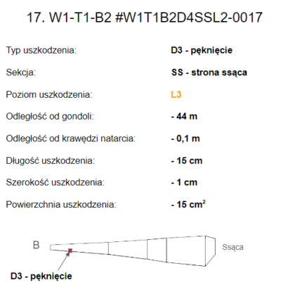 For each fault, the report contains a detailed description including the fault category, its location on the given blade, the size and severity of the damage.